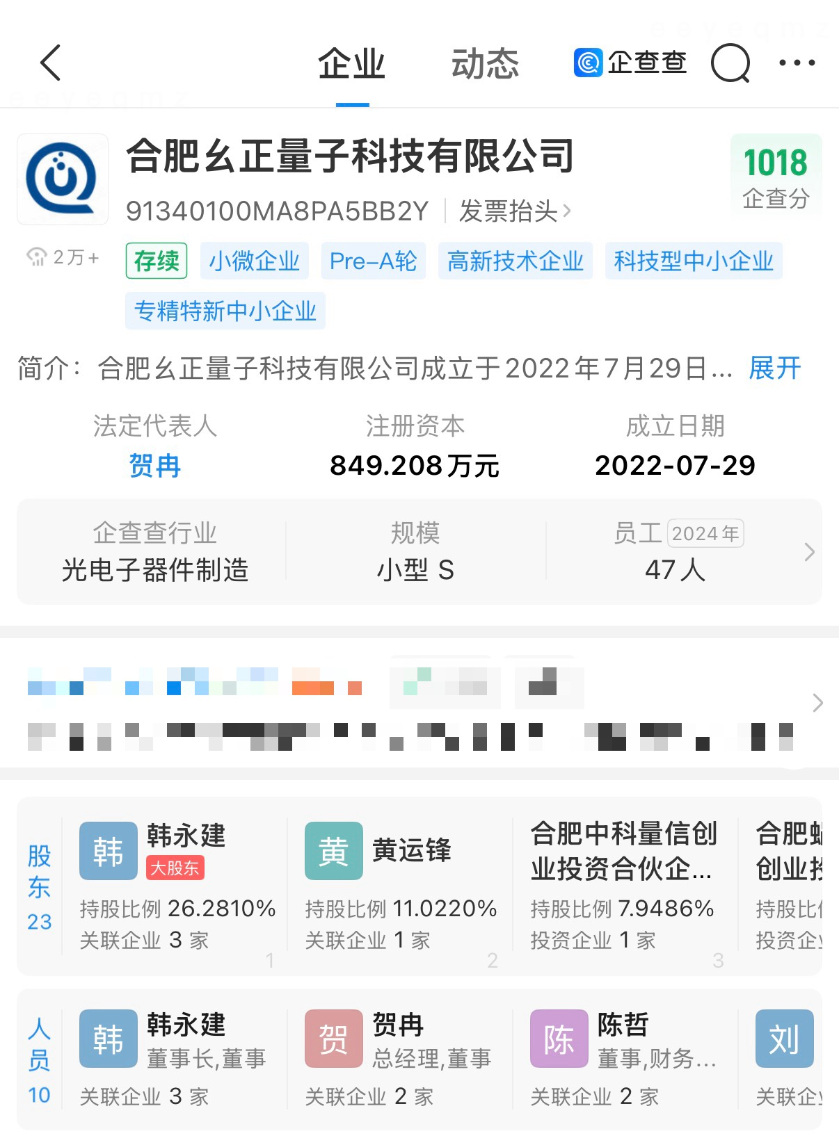 企查查显示,合肥幺正量子科技有限公司成立于2022年7月29日,法定代表人为贺冉,现由韩永建、黄运锋等及上述新增股东共同持股。官网显示,幺正量子是目前国内唯一基于QCCD(量子电荷耦合架构)离子阱技术路线的量子计算公司。