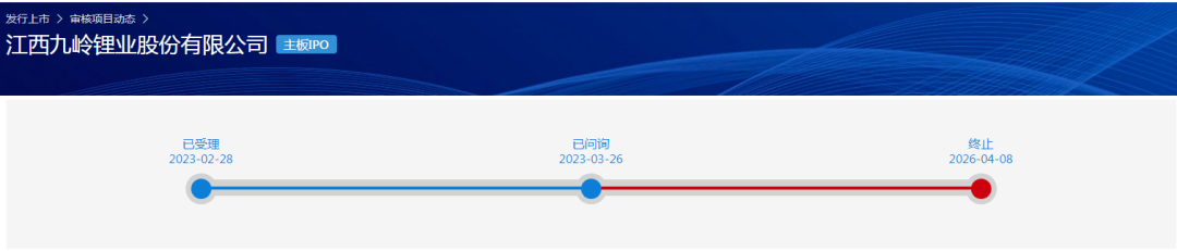 本网讯 4月8日,江西九岭锂业股份有限公司上交所主板IPO审核状态变更为“终止”,原因是九岭锂业及其保荐人撤回发行上市申请,上交所根据《上海证券交易所股票发行上市审核规则》第六十三条有关规定,终止其发行上市审核。