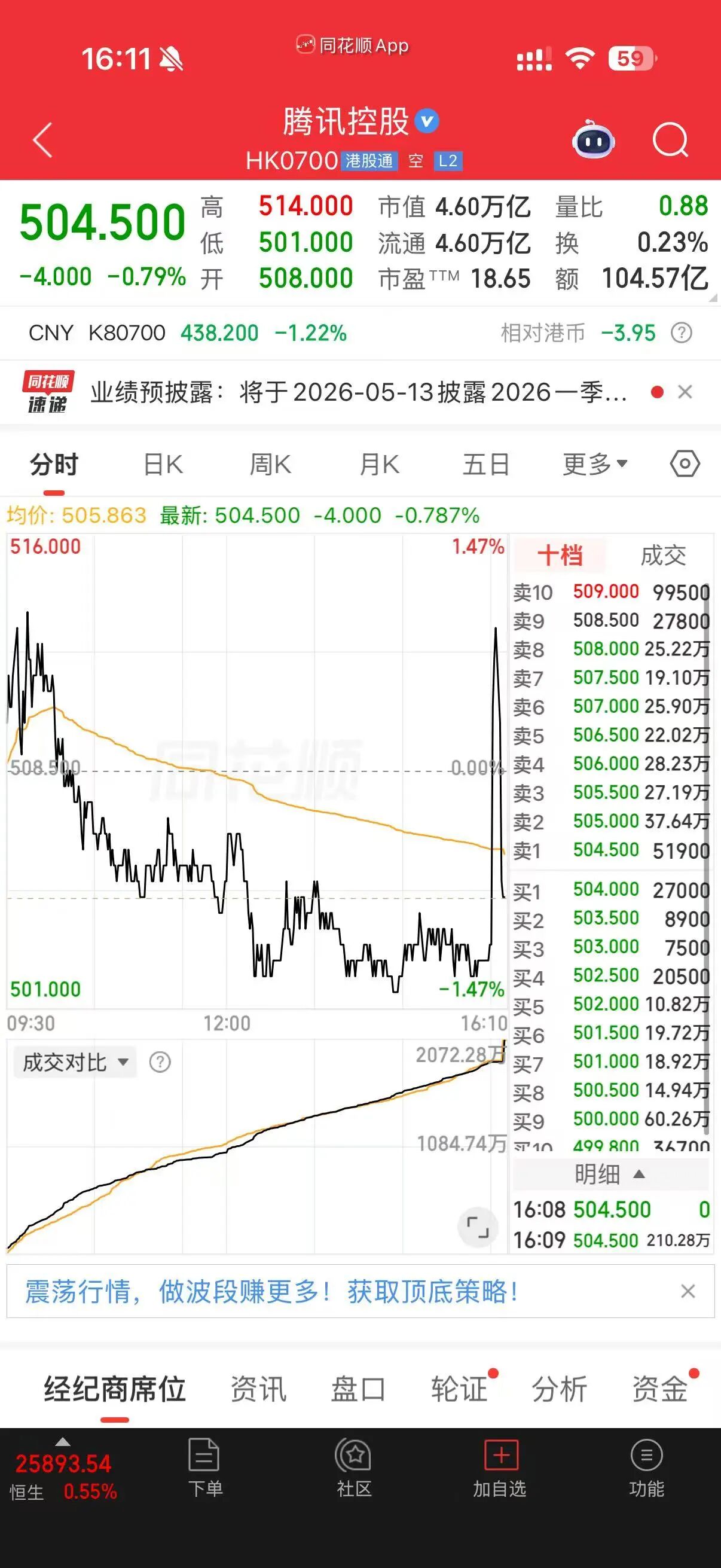 4月10日,截至收盘,腾讯控股(0700.HK)跌0.79%,报收504.5港元。较1月2日首个交易日收盘价623港元,腾讯控股年内股价已跌超百元。