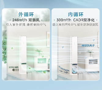 新风系统:柜机新风量最高可达246m3/h,约20分钟可完成全屋空气置换。新风可独立于制冷制热功能单独开启,适合春秋季或不需要调温但需要通风的场景。