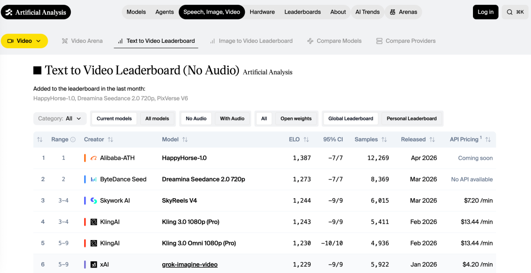 根据Artificial Analysis榜单数据,HappyHorse-1.0目前在文生视频和图生视频两个无音频类别中均排名第一,文生视频(无音频)ELO跑分1386,图生视频(无音频)ELO跑分1412,均领先字节的Seedance 2.0。