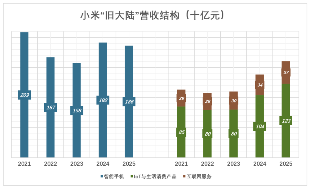 2025年,手机业务毛利润率下降1.8个百分点,其中Q4仅为8.3%,主要原因是内存涨价。但互联网业务坚挺、IoT业务及时补位,“旧大陆”全年毛利润773亿、同比增长8.2%。