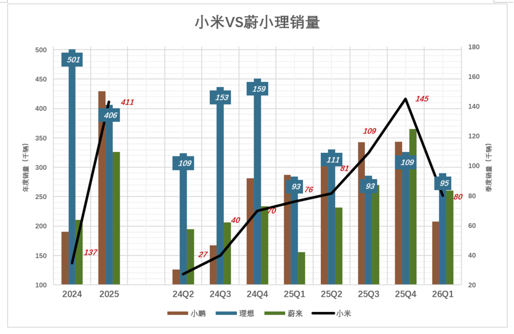 2026年Q1,小米交付量回落至约80万辆,低于理想、高于小鹏,与蔚来相差无几。