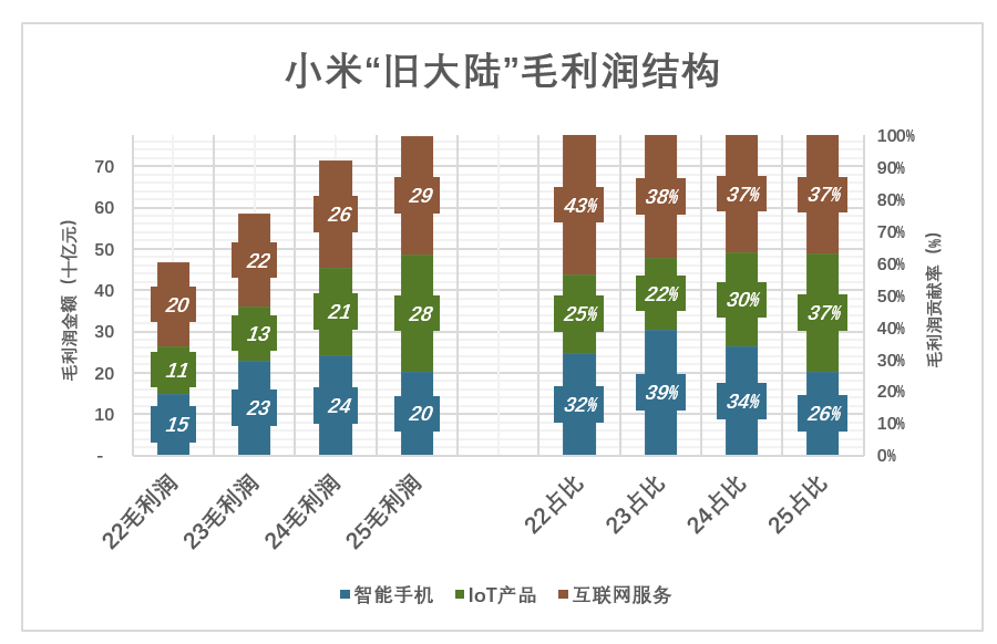小米最赚钱的业务不是智能手机而是互联网服务。2025年,IoT业务毛利润首次超过手机,看趋势将成为最赚钱的业务: