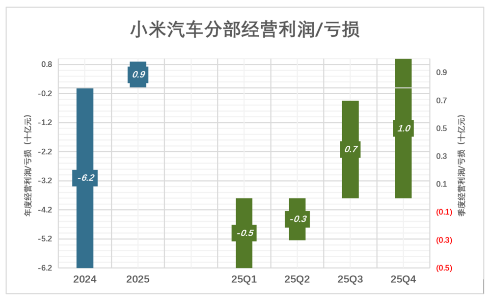 2024年Q2,小米汽车开始交付,“智能电动车”分部全年经营利润(毛利润减费用)为负62亿。令人意想不到的是,2025年“智能电动车”业务就扭亏为盈,实现经营收益9亿元。