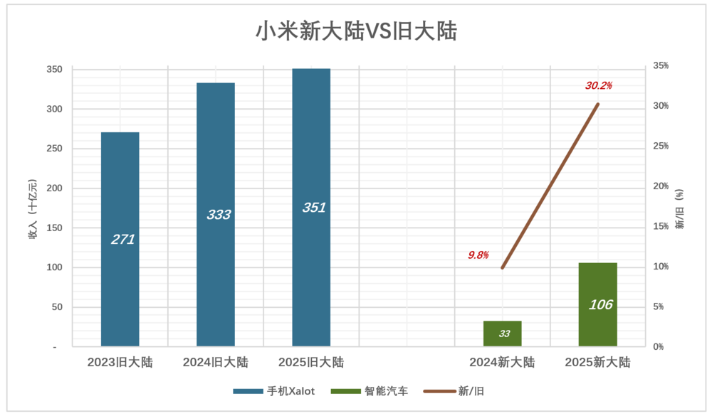 小米的新大陆是智能电动车。自2024年年报起,小米将收入分为两个大类披露——手机xAIoT(旧大陆)、智能电动车(新大陆):