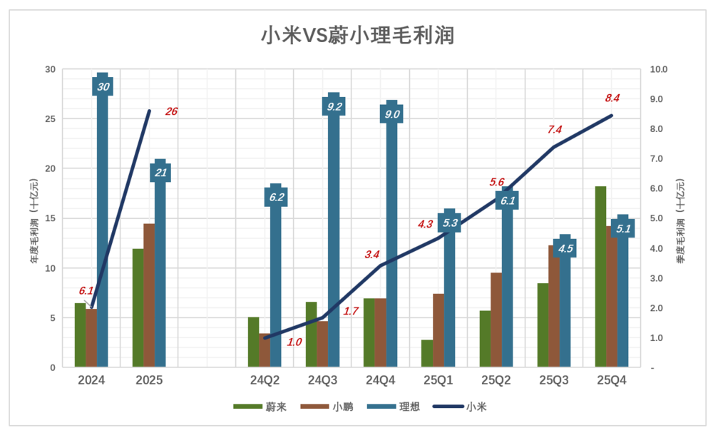 2025年Q3,毛利润73.8亿(毛利润率25.5%),超过蔚小理;