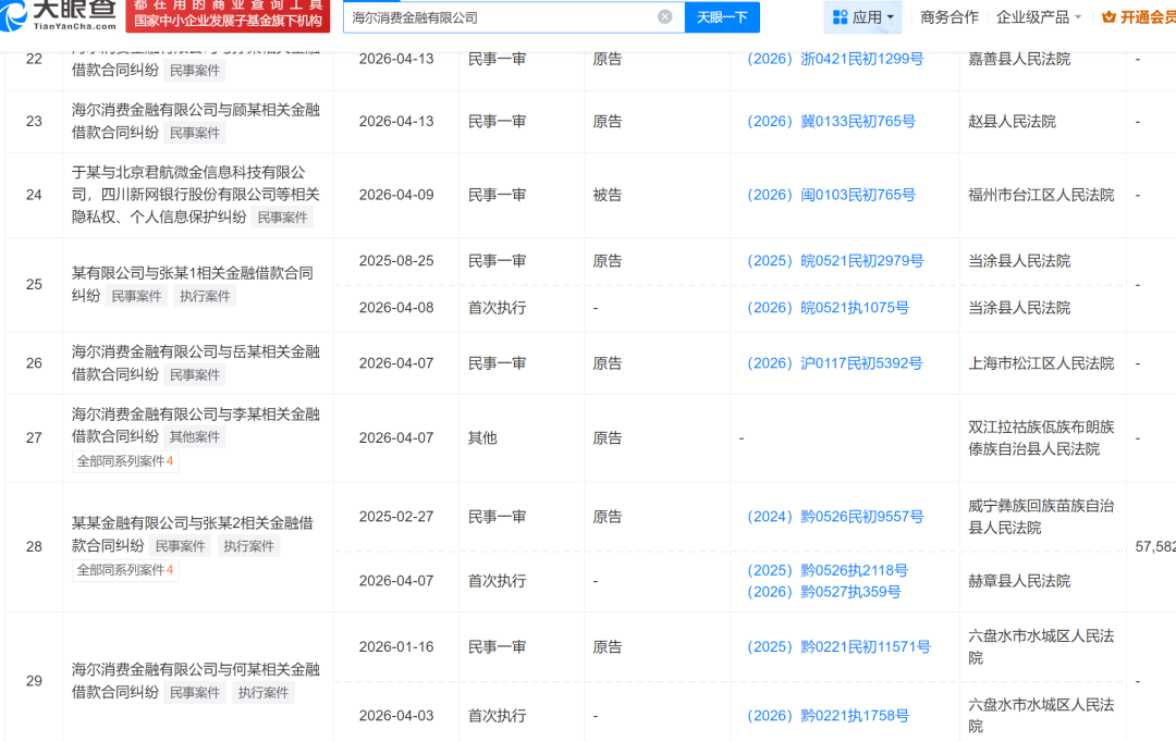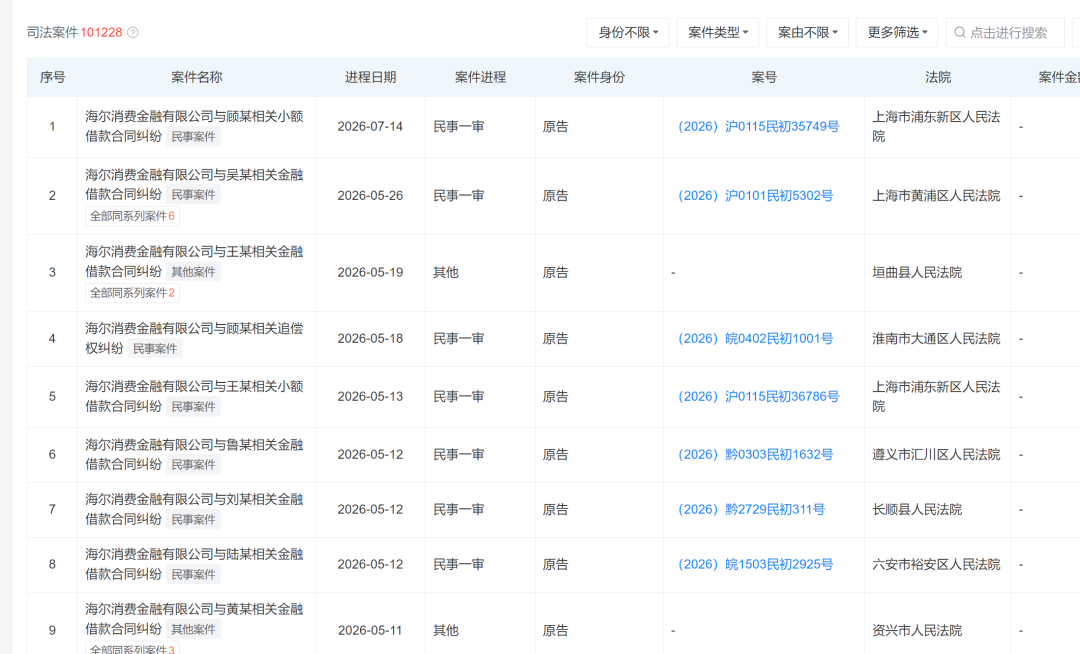 据天眼查,海尔消金投诉高达10万条,基本都是因为借款合同纠纷,此外还涉及追偿权纠纷等情形。此外,海尔消费金融则因为触发隐私等问题被列为被告。