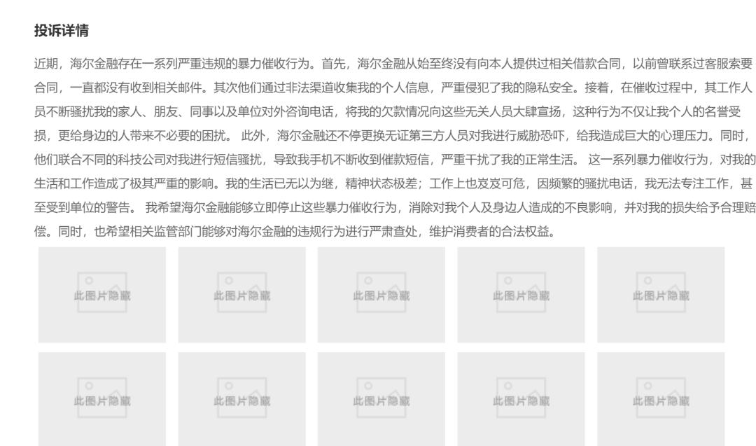 1)暴力催收。有用户投诉,海尔消金泄露隐私、暴力催收,第三方多次发短信威胁;还有用户投诉称,非法渠道收集个人信息,催收过程中骚扰家人、朋友、同事等,并将其个人情况大肆宣扬。