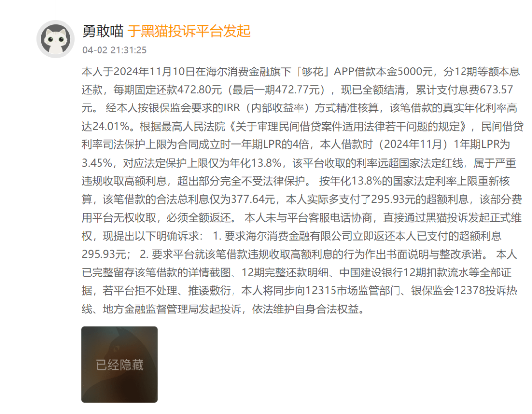 4)海尔消金同样存在高额利息的情形,有用户投诉,自己在24年11月在够花借款5000元,12期等额,每期固定472.8元,累计支付息费673.57元。