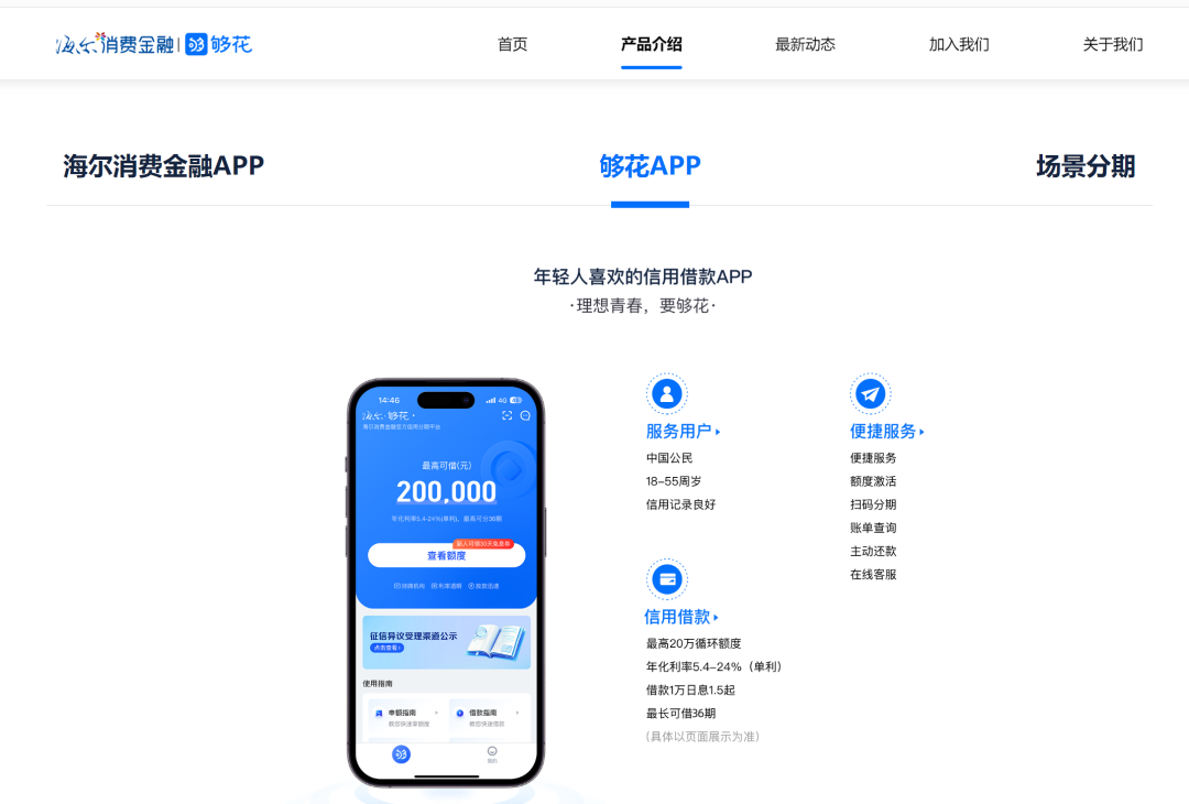 海尔消金由成立于2014年,由海尔集团发起设立,目前主要通过海尔消费金融APP、够花APP和场景分期进行运营。