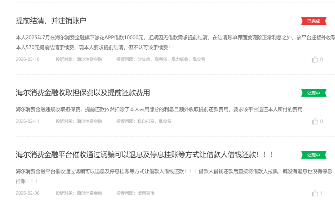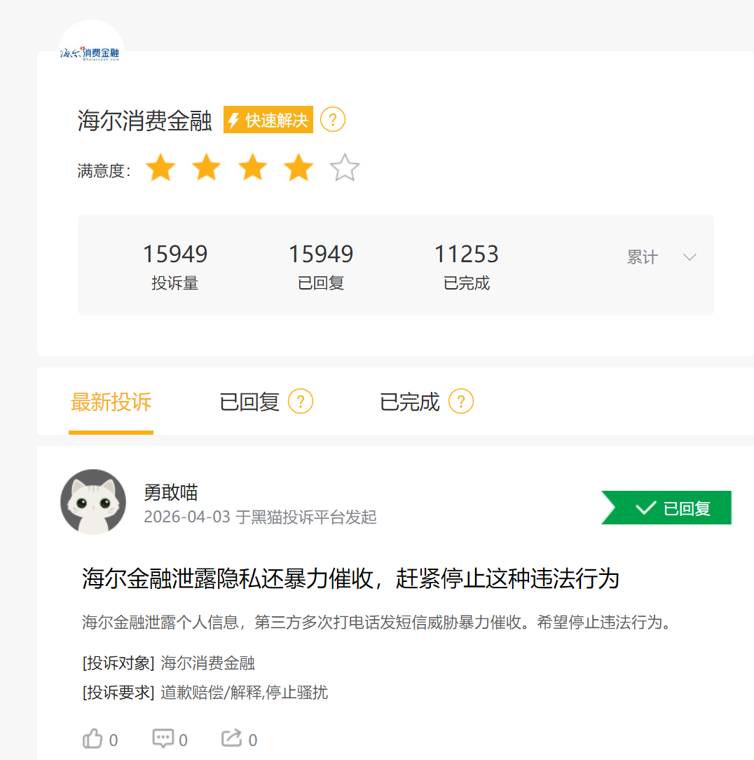 不过,金石随笔发现,在黑猫投诉平台,关于海尔消金的投诉开始增多。累计投诉高达1.6万条,近30日投诉超300条。核心聚焦暴力催收、借款利率过高、违规收费、诱导贷款等行业乱象。