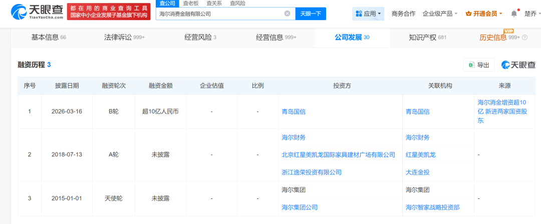 天眼查显示,海尔消金在3月16日完成B轮融资,本次融资金额超10亿,青岛国信领投,其中,青岛国信背后是青岛国资,聚焦金融、海洋、生物医疗等产业。
