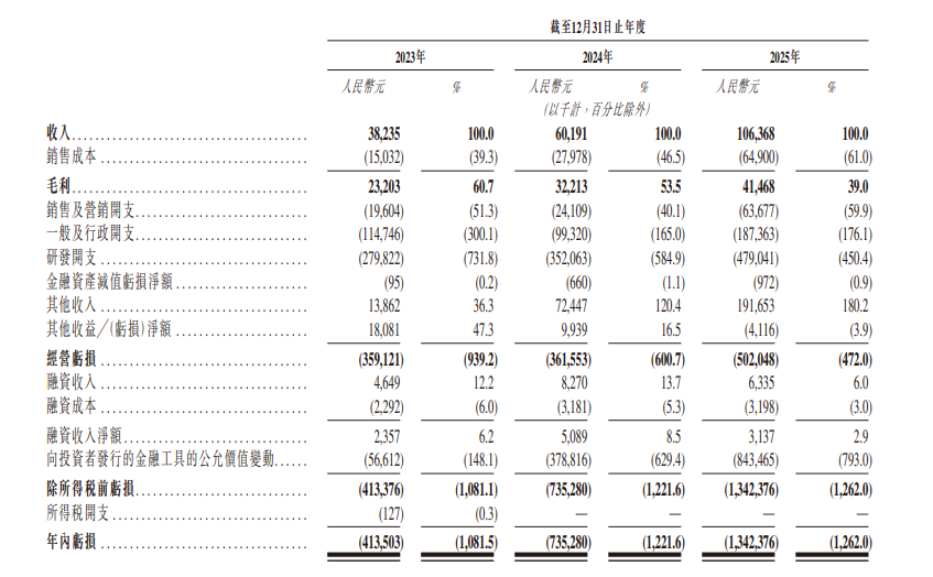 来源:曦智科技招股书营收方面,曦智科技仍处于商业化早期阶段,2023年、2024年、2025年营收分别为3823.5万元、6019万元、1.06亿元,呈现持续增长趋势,但整体规模仍然有限。这一阶段性特征,也与硬科技企业“高研发投入、慢收入释放”的典型路径相一致。