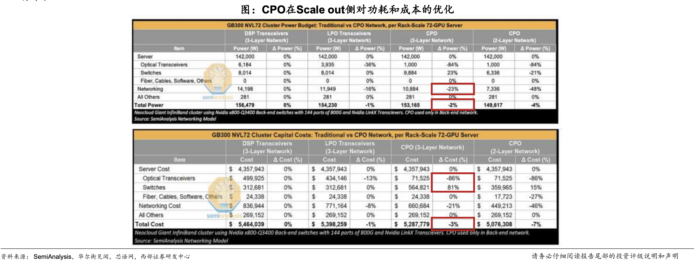 在Scale-out侧,CPO对功耗和成本的改善幅度相对有限(三层网络架构下总功耗仅优化2%、总成本仅优化3%),商业化节奏相对平缓。