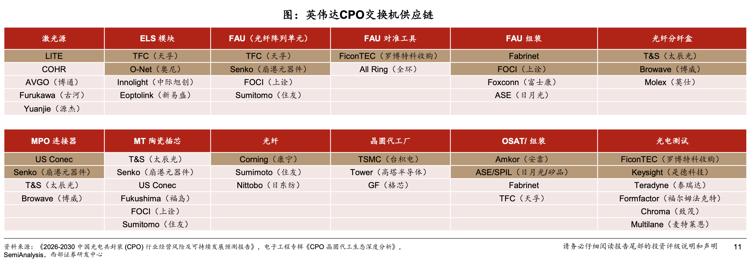 从英伟达CPO交换机供应链图谱来看,激光源、ELS模块、FAU、MPO连接器、晶圆代工、OSAT封装、光电测试等各环节均涉及多家供应商,但具备完整光电融合工艺能力的代工厂、专用高精度光电测试设备供应商及标准化封装材料商仍相当稀缺。