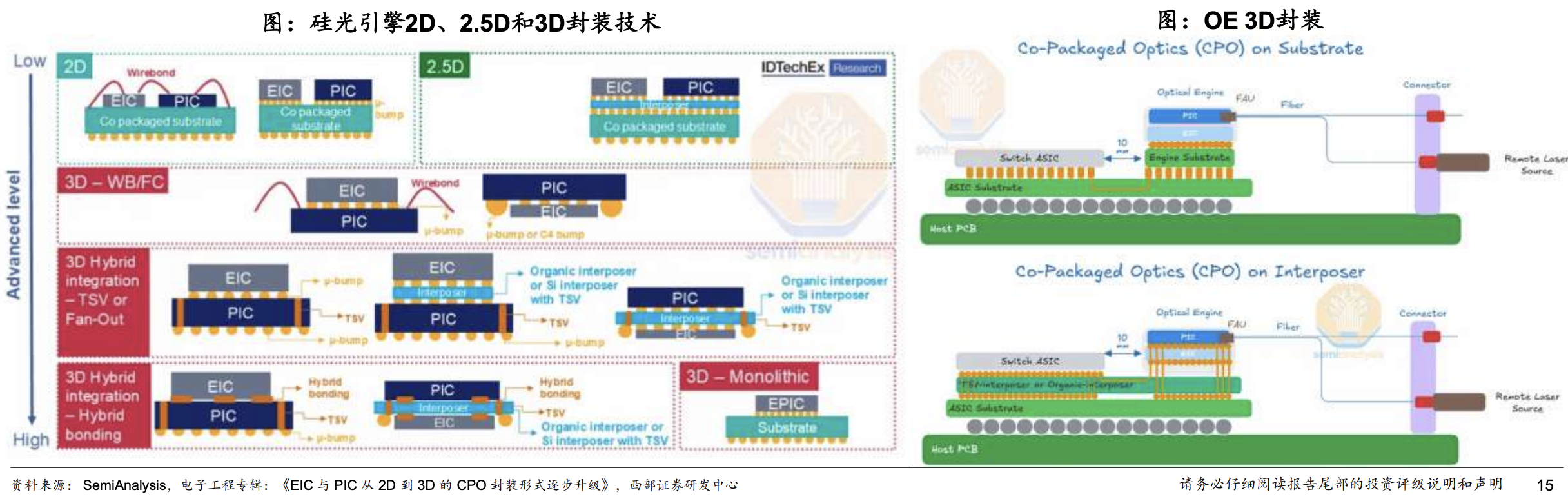 PIC与EIC封装:从2D、2.5D逐步向3D封装演进,3D封装通过垂直互连实现更短传输距离、更高集成度,但工艺难度和良率压力显著上升,是当前CPO技术研究的热点与难点。