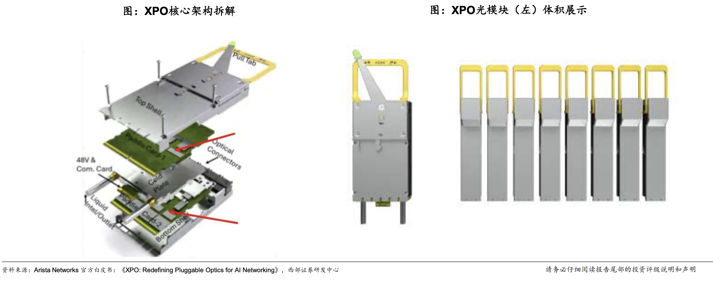 XPO(超高密度可插拔光学)则代表可插拔路线的激进演进。2026年3月,Arista正式宣布成立XPO MSA,目标形态为64通道、12.8Tbps单模块带宽,支持每模块最高400W的冷板散热能力,相对1600G-OSFP光模块实现约4倍密度提升,兼具大带宽、原生液冷和可插拔运维特性。