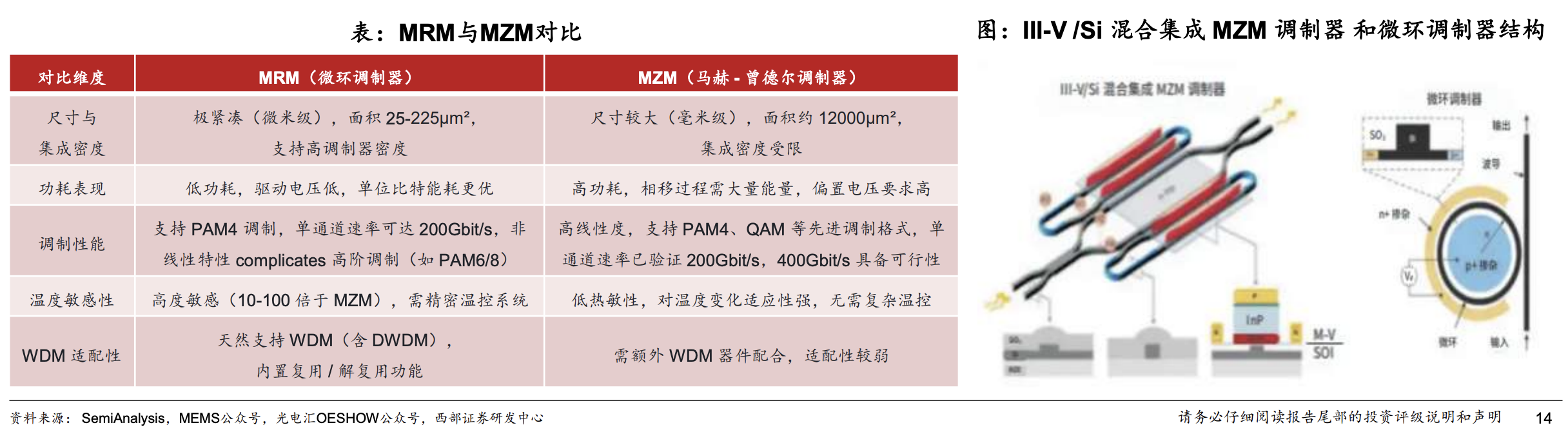 微环调制器(MRM):相较于马赫-曾德尔调制器(MZM),MRM尺寸极紧凑(面积25-225μm2),功耗低,天然支持WDM,但温度敏感性极高(约为MZM的10-100倍),需精密温控系统,非线性特性也给高阶调制带来挑战。