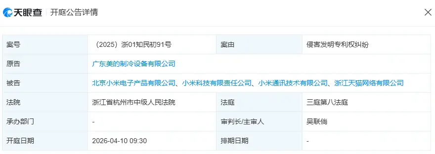 根据天眼查及行业媒体发布的官网截图,相关案件在4月10日开庭。具体来看,原告“美的系”企业为广东美的制冷设备,被告为“小米系”三家企业,包括北京小米电子产品、小米科技、小米通讯技术等。