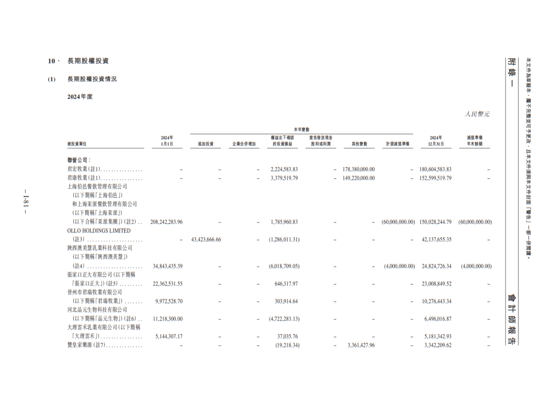 其中,对现制酸奶品牌“茉酸奶”的投资中,曾两度增资,最终持股42.86%,然而“茉酸奶”在经历快速扩张后,陷入“价格刺客”等舆论风波,门店数量从巅峰期的1600家大幅收缩,直接导致君乐宝在2024年对其投资计提了6000万元减值。
