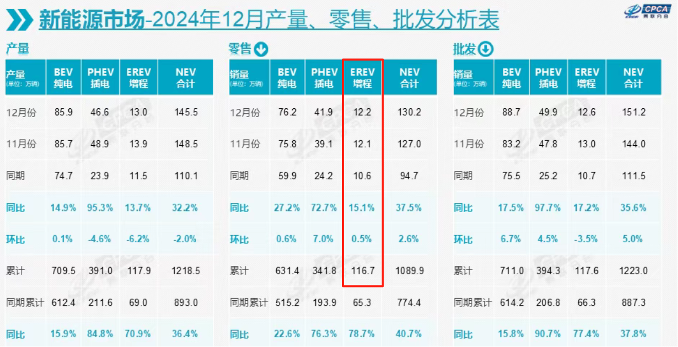 这一点可以从“没有续航压力”的增程车销量上清楚看到。2023年,增程车的销量还不足40万辆,到了2024年,增程车全年卖出了116.7万辆,占到新能源车份额的9.1%。吉利、长安、奇瑞等传统车企纷纷入局,而彼时,广汽还不为所动。