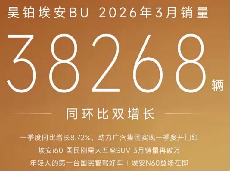 2026年第一季度埃安累计销售了75389辆,同比增长8.72%,尤其是3月单月销量为38268辆,比前两个月的总和还多。