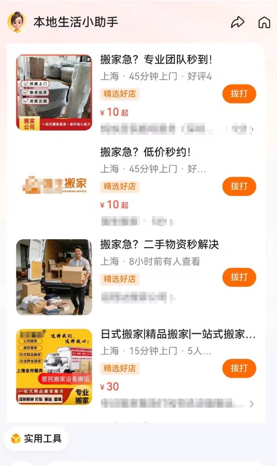 搜索“上海附近搬家”,小慧提供了4家搬家公司卡片,可直接拨打电话,未来或可用于商业化展示。