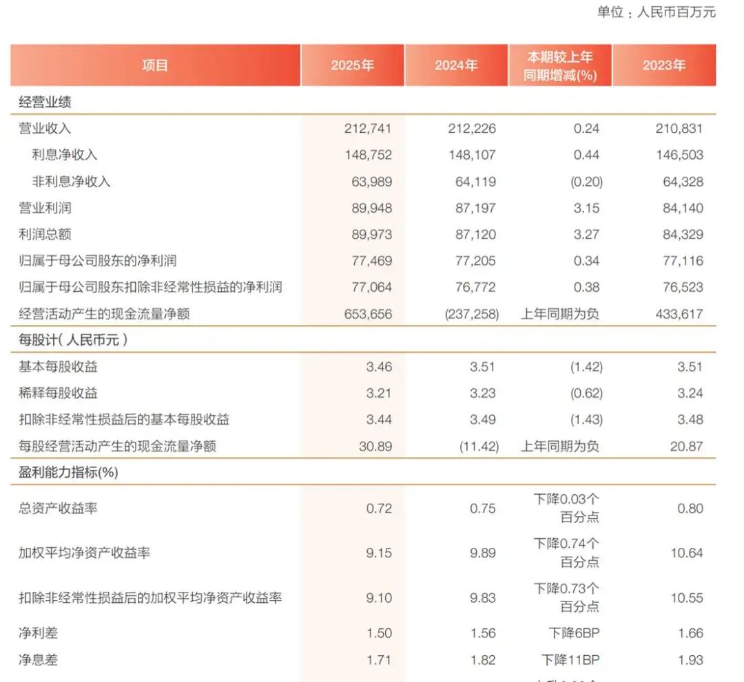 营收层面,净利润 706.18 亿元,比上年增长 2.98%;营业收入 2,124.75 亿元,比上年下降0.55%;其中实现利息净收入 1,444.69 亿元,比上年下降 1.51%。