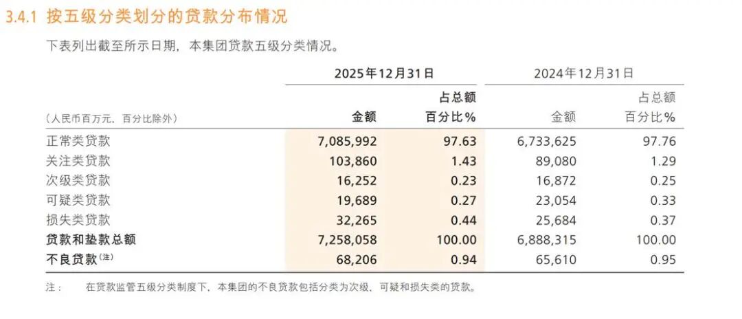 截至2025年末,该行资产总额130,705.23亿元,较上年末增长7.56%;不良贷款余额682.06亿元,较上年末增加25.96亿元;不良贷款率0.94%,较上年末下降 0.01个百分点。