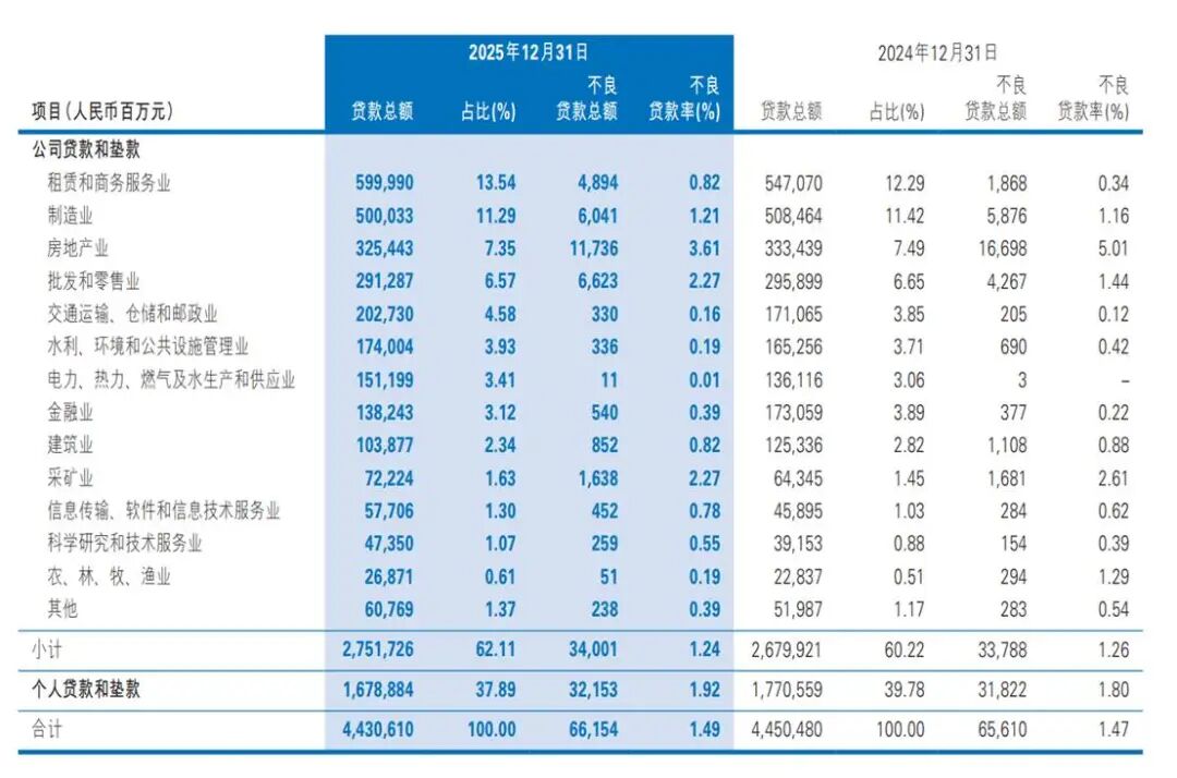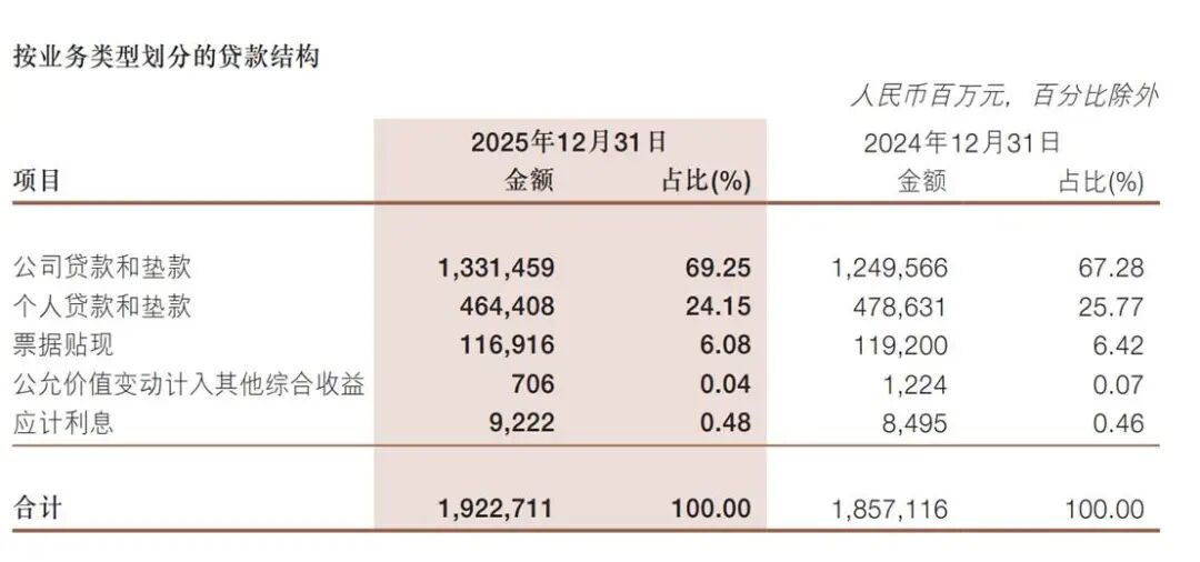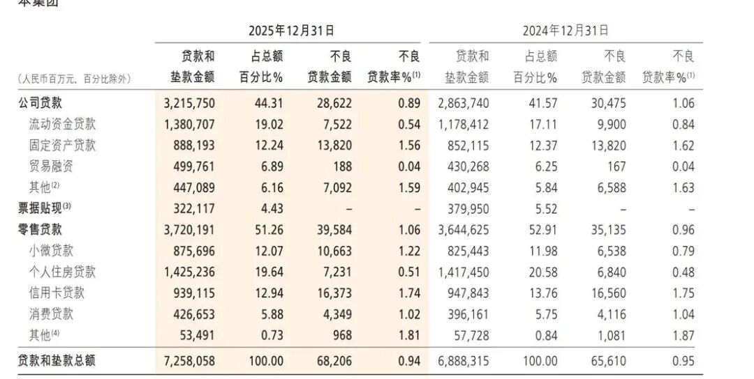 包括公司贷款和垫款1.3万亿元,比上年末增长6.55%;个人贷款和垫款4644.08亿元,比上年末下降2.97%。