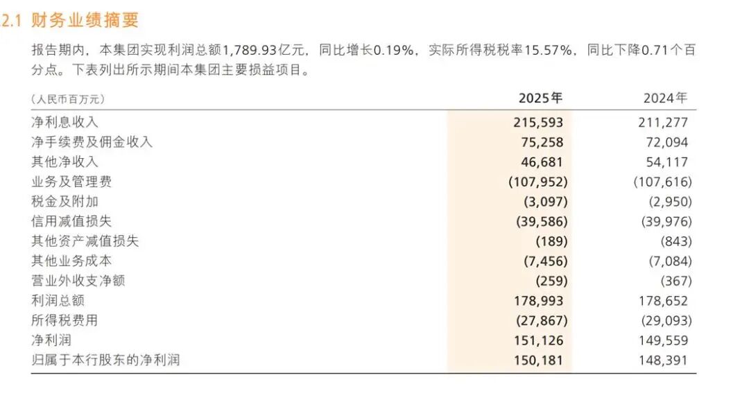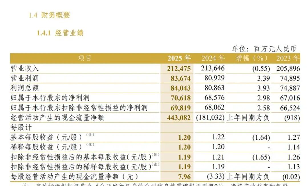 2025年,招商银行营业收入3,375.32亿元,同比增长0.01%;净利润1,501.81亿元,同比增长1.21%。