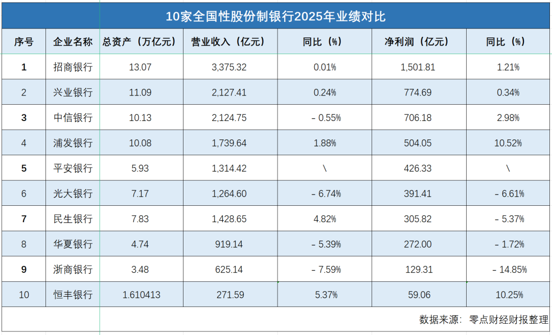 12家股份制银行2025年核心数据拆解:浙商净利大跌近15%,恒丰营收净利增速居首位