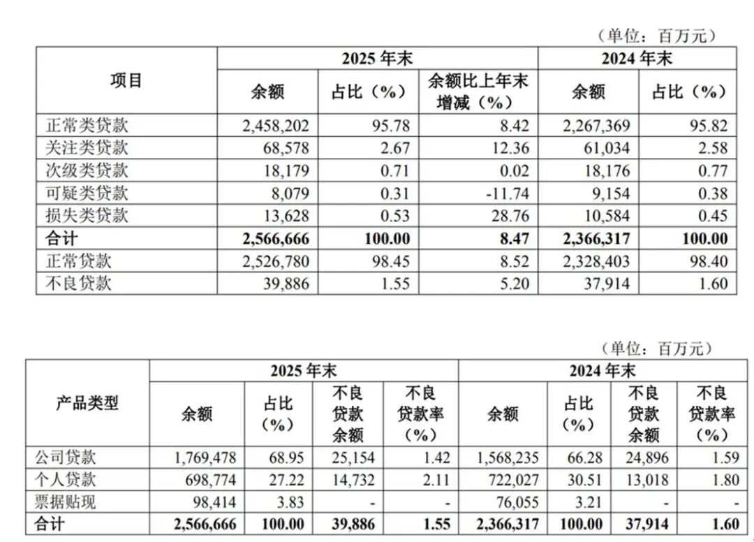 信用卡层面,截至2025年底,该行信用卡累计发卡 464.16万张,较年初增加21.81万张;信用卡(消费金融)贷款余额336.78亿元,较年初增加3.00亿元。