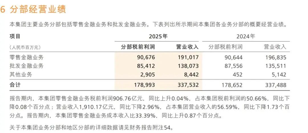 零售金融业务税前利润906.76亿元,同比上升0.04%,占税前利润的50.66%;营业收入1,910.17亿元,同比下降2.96%,占营业收入的56.59%,同比下降1.73个百分点。