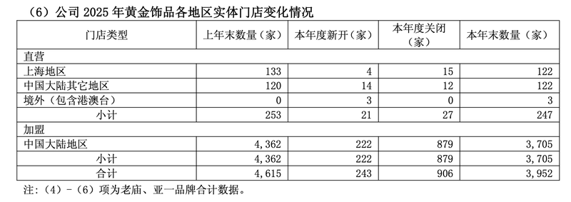 豫园股份2025年黄金饰品各地区实体门店变化情况。财报截图