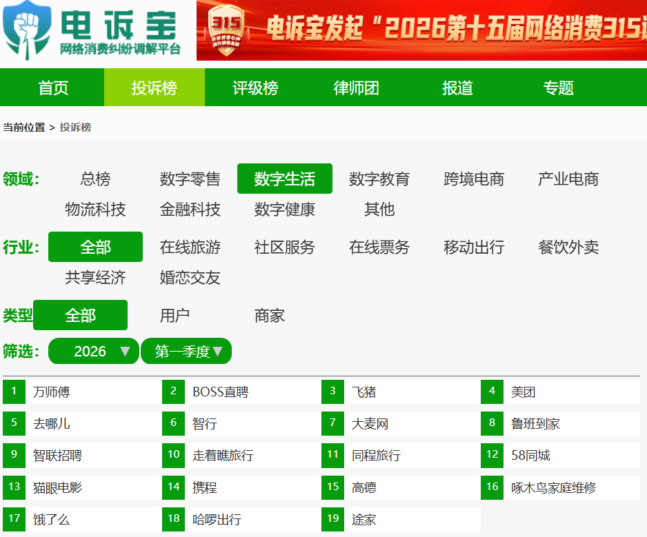 啄木鸟家庭维修 BOSS直聘 58同城 途家民宿 万师傅等入选Q1生活服务电商十大典型投诉案例