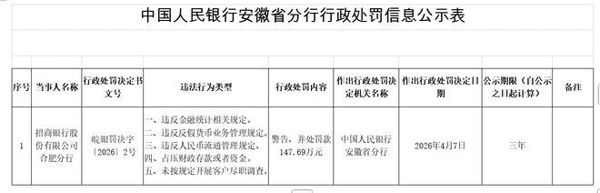 招商银行合肥分行被罚147.69万,涉多项金融违规