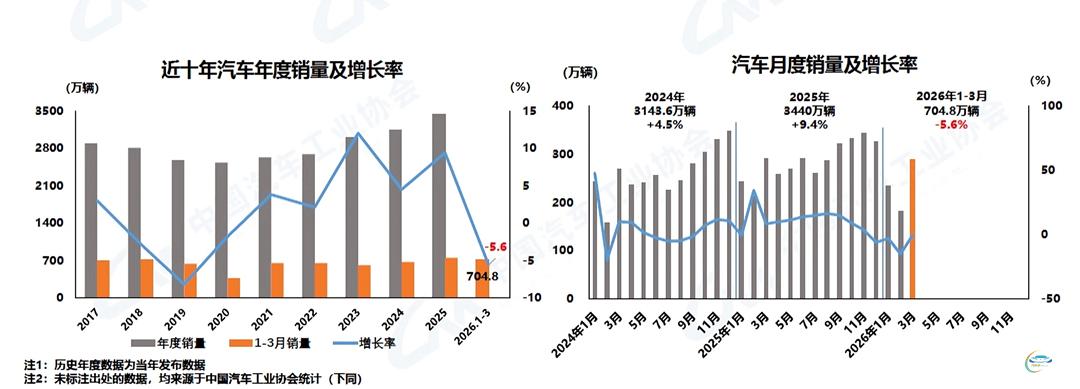 整个一季度累计数据来看,1-3月,汽车产销分别完成703.9万辆和704.8万辆,同比分别下降6.9%和5.6%。