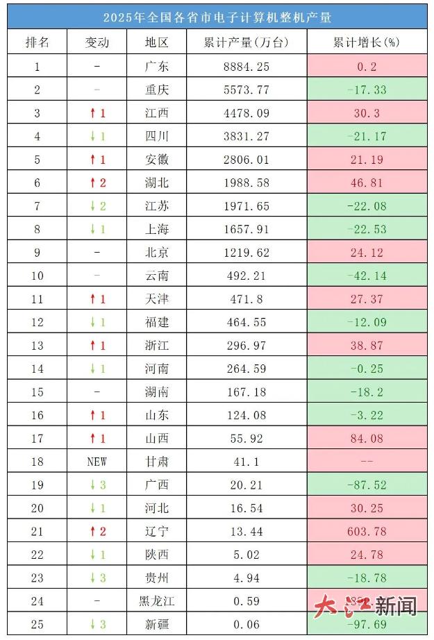 江西计算机制造今年也迎来了自己的高光时刻。2025年全年产量,江西以4478.09万台超过四川,全国计算机产量“前三甲”有江西。