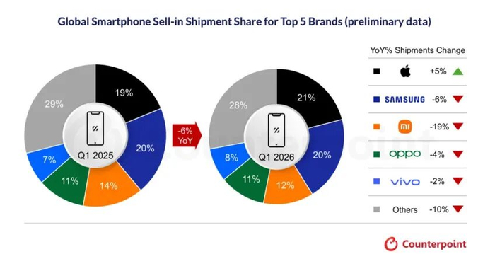 2026年第一季度全球智能手机市场格局正式尘埃落定,国外权威机构Counterpoint Research发布的最新出货量数据,直接揭露了行业当下的残酷现状:全球手机市场整体出货量大幅下滑19%,各大品牌纷纷陷入销量寒冬,唯独苹果实现逆势暴涨,一举拿下全球出货量榜首,彻底改写了手机市场的竞争格局。