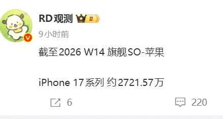 国内市场的销量数据更能印证苹果的火爆,据博主RD观测统计,截至2026年第十四周,iPhone17系列国内累计销量已高达2721.57万台。其中iPhone17ProMax长期霸占销量榜单首位,出货量占到整个系列的一半以上,即便机型均价突破万元,依旧保持着供不应求的态势。对比之下,当下国产销量标杆华为Mate80系列,累计销量刚突破500万台,与iPhone17系列差距悬殊,无论是全球市场还是国内市场,苹果都占据着绝对领先地位。