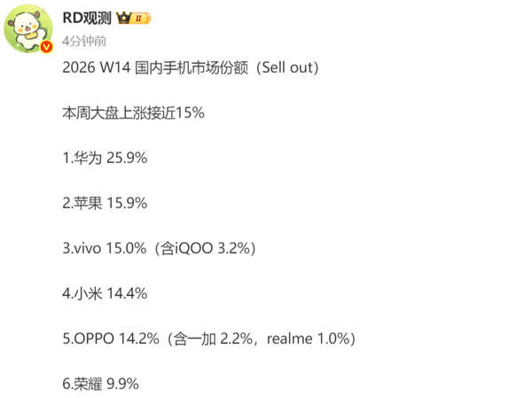 4月10日,CNMO注意到,博主“RD观测”公布2026年第14周中国智能手机市场的出货量份额排名: