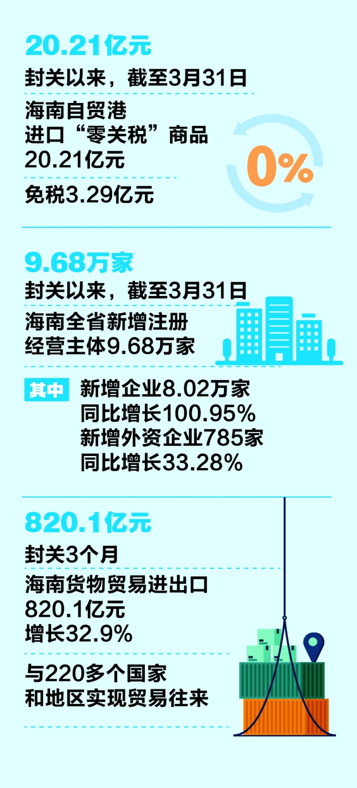 越来越多的企业从“观望”变成“进场”。封关以来,截至3月31日,海南全省新增注册经营主体9.68万家。其中:新增企业8.02万家,同比增长100.95%;新增外资企业785家,同比增长33.28%。封关3个月,海南货物贸易进出口820.1亿元,增长32.9%,与220多个国家和地区实现贸易往来。