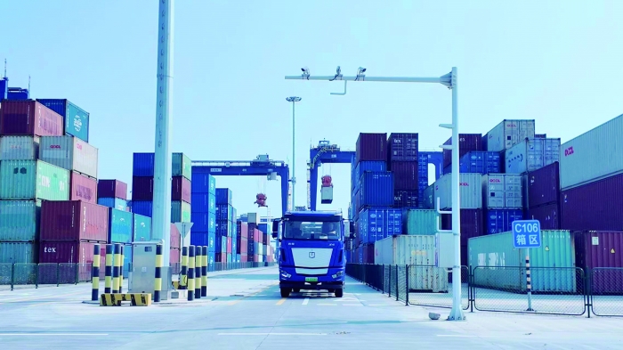 货车在中远海运洋浦港装运货物。 林铭溱 摄