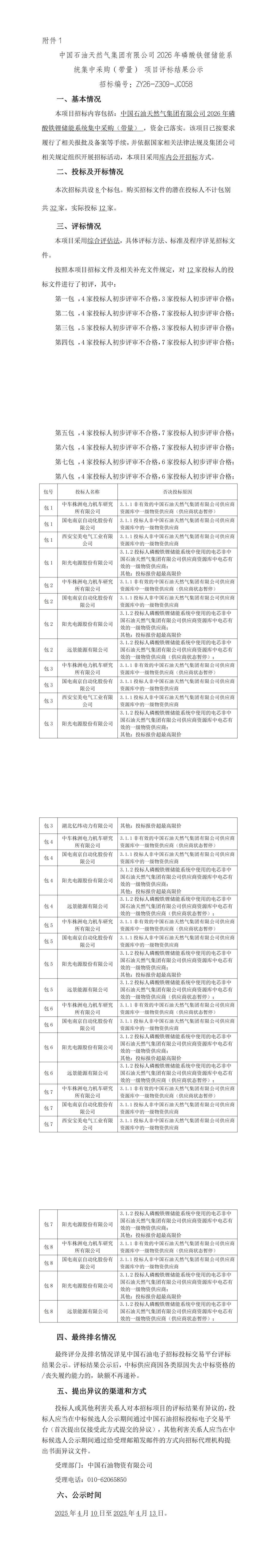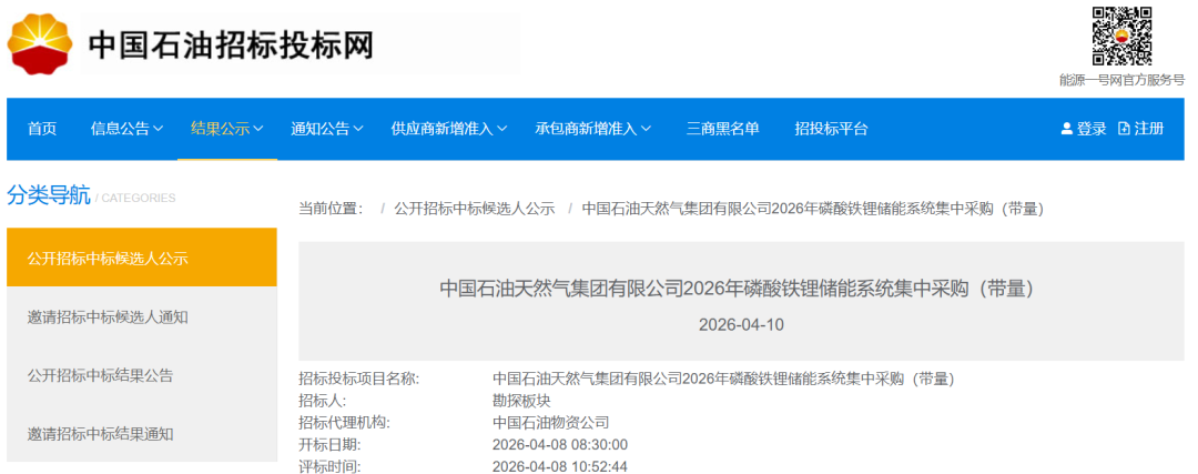 4月10日,中国石油天然气集团有限公司2026年磷酸铁锂储能系统集中采购(带量)中标候选人公示。