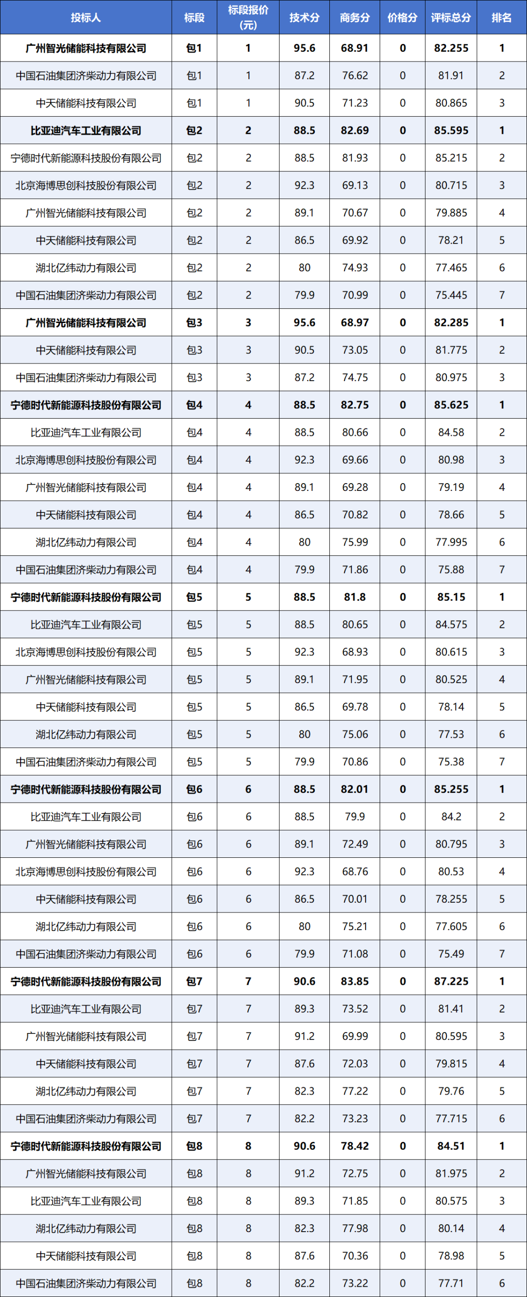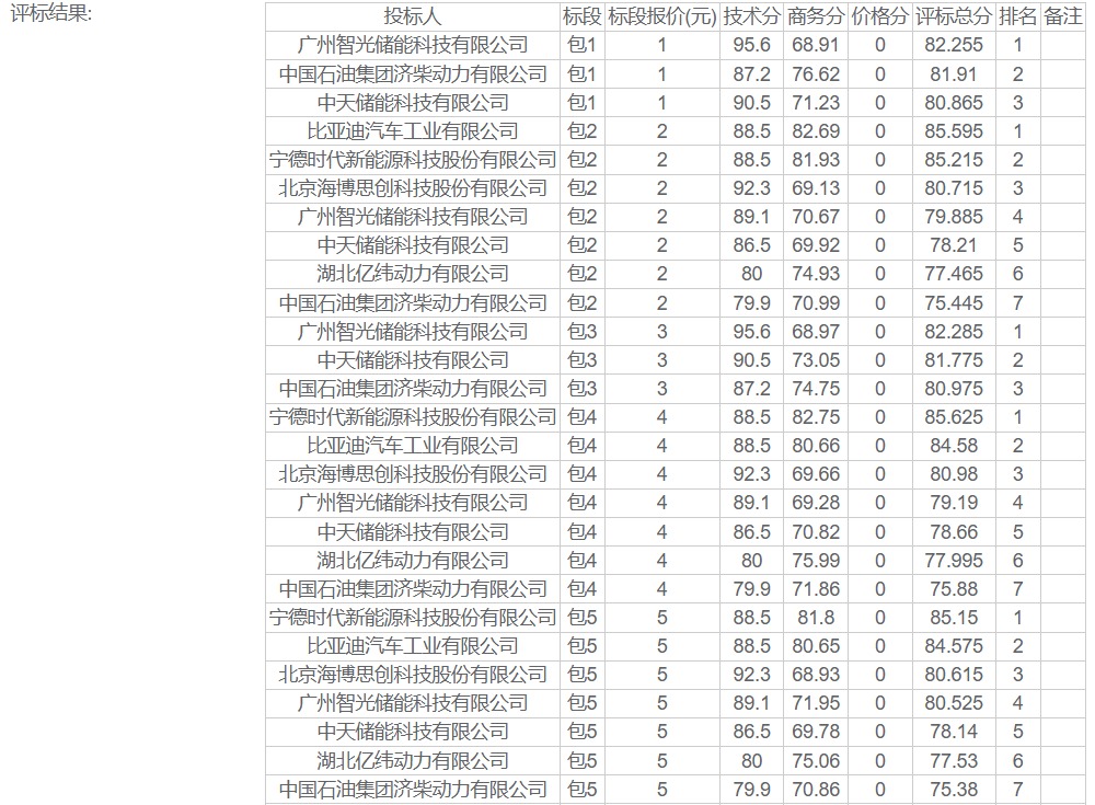 8个标包的中标候选人包括:广州智光储能科技有限公司、中国石油集团济柴动力有限公司、中天储能科技有限公司、比亚迪汽车工业有限公司、宁德时代新能源科技股份有限公司、北京海博思创科技股份有限公司、湖北亿纬动力有限公司7家企业。