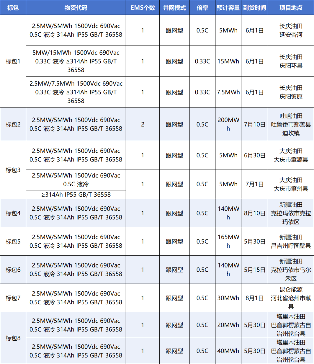 此批采购含8个标包分布在6个油田12个项目区域,共采购772.5MWh跟网型储能系统,覆盖0.33C、0.5C 电芯规格。