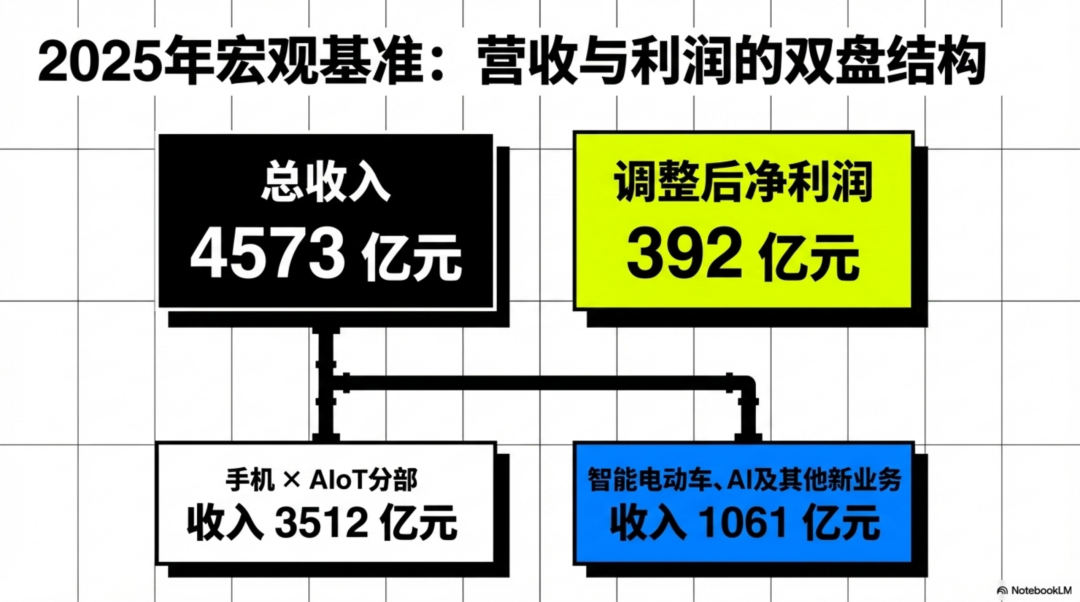 2025 年,小米总收入 4573 亿元,调整后净利润 392 亿元;其中手机× AIoT分部收入 3512 亿元,智能电动车、AI 及其他新业务收入 1061 亿元。