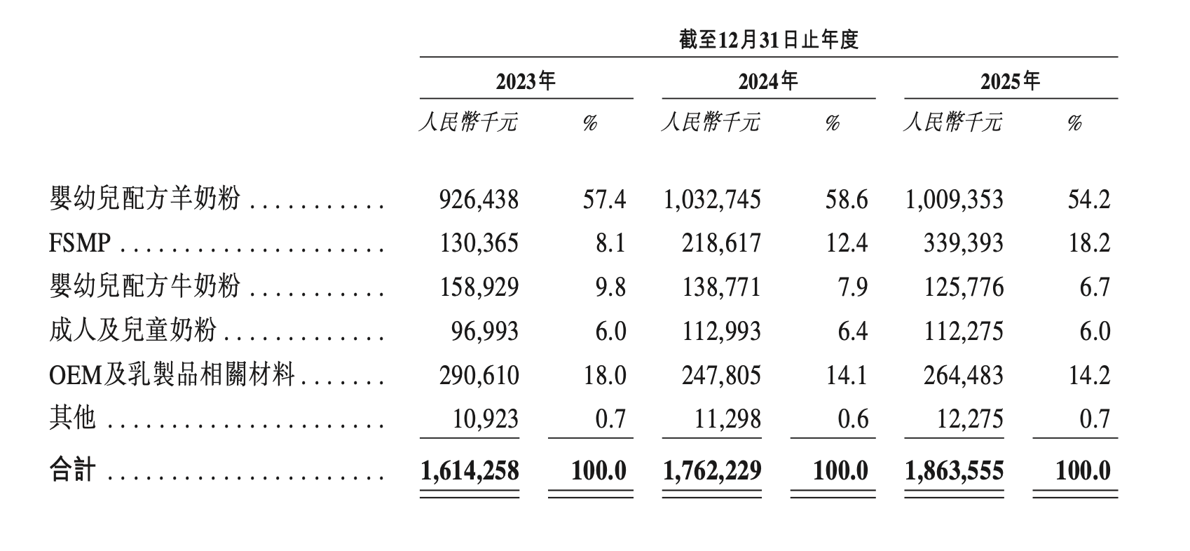 相比之下,FSMP的总营收虽然仍无法与羊奶粉产品相比较,但该品类近几年增长趋势明显,总营收从2023年的1.3亿元提升至2025年的3.4亿元,营收占比从2023年的8.1%提升至2025年的18.2%。